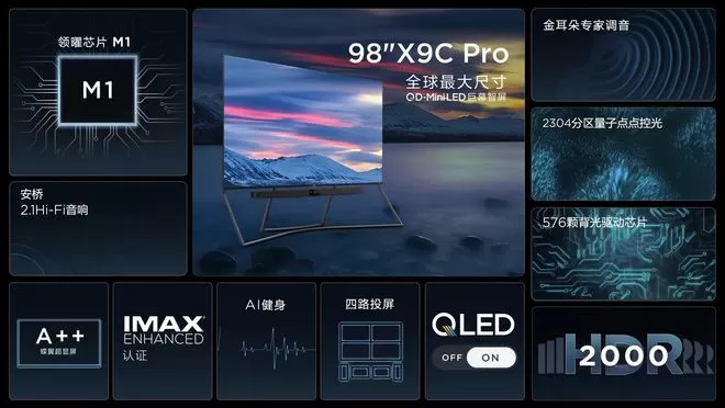 TCL 98X9C Pro QD-Mini LED巨幕智屏是去年TCL 98X9C IMAX Enhanced巨幕智屏的升级款,在后者原色量子点屏幕的基础上升级成了QD-Mini LED,带来更广的色域、更高的峰值亮度、更精准的色彩呈现。此外98X9C Pro在处理器、音响等硬件配置上都比98X9C有一定程度的提升。