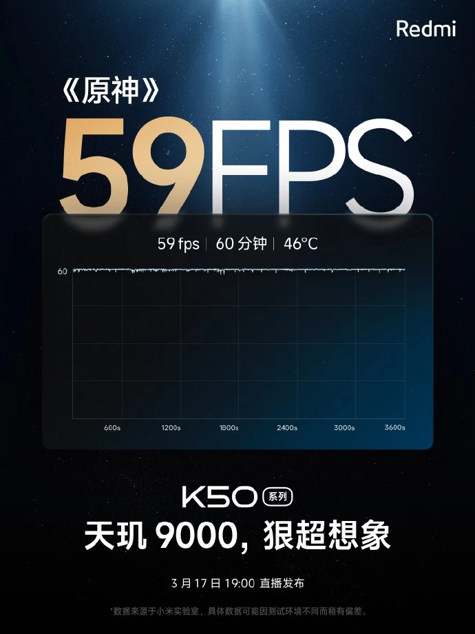 Redmi K50超大杯《原神》59帧,搭载天玑9000旗舰芯(图源Redmi官微)