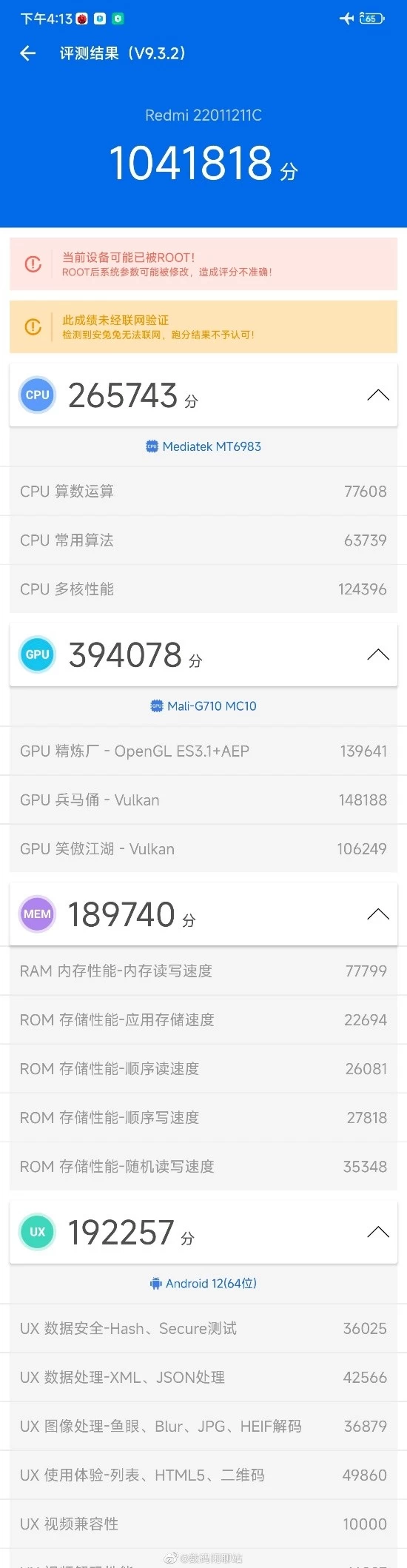 Redmi K50超大杯搭载天玑9000,安兔兔跑分飙到104万(图源微博)