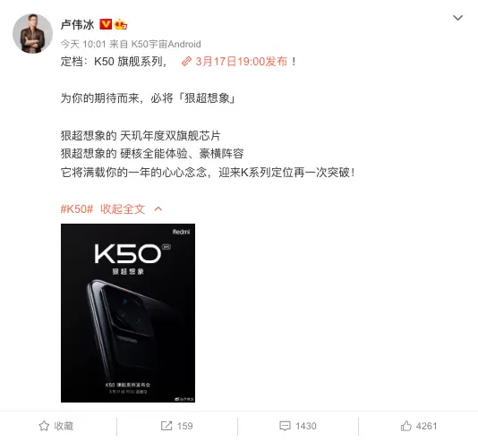 Redmi品牌总经理卢伟冰公布K50发布会日期