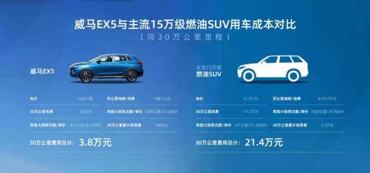 据威马EX5车主介绍,在三年内,威马EX5在行驶里程超过30万的情况下进行了五次维护,五次维护的总成本仅为2000元。威马EX5的100公里功耗仅为15度,30万公里的总充电成本仅为3.6万元。换言之,威马EX5在三年内行驶30万公里的综合用车成本仅为3.8万元。与价格相同、里程相同的燃油车相比,这具有充分的节能属性。