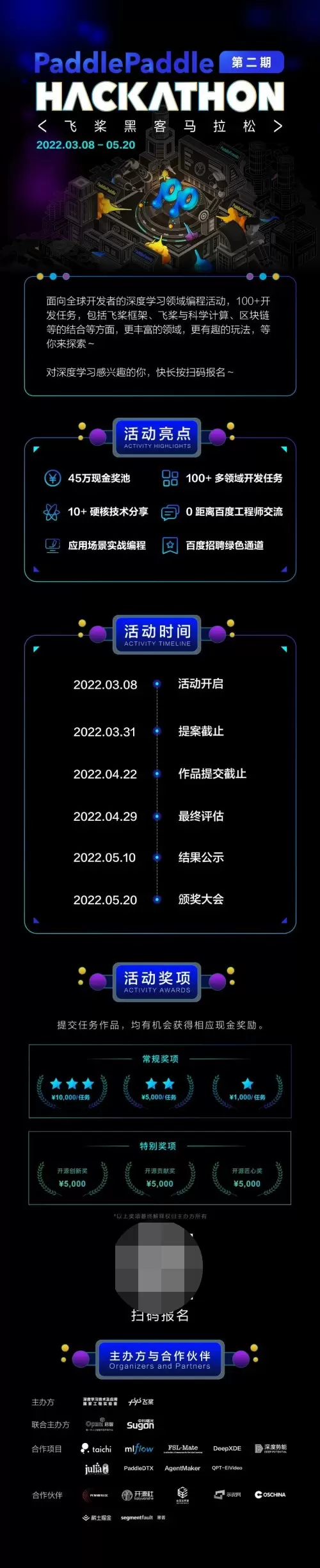 据悉,此次活动支持100多个领域的开发任务,包含了飞桨框架、科学计算、区块链等多个项目,同时奖金池累积高达45万。 目前,百度飞桨黑客马拉松活动正式开通报名,期待更多的开发者积极参与,共享这一开发盛宴。