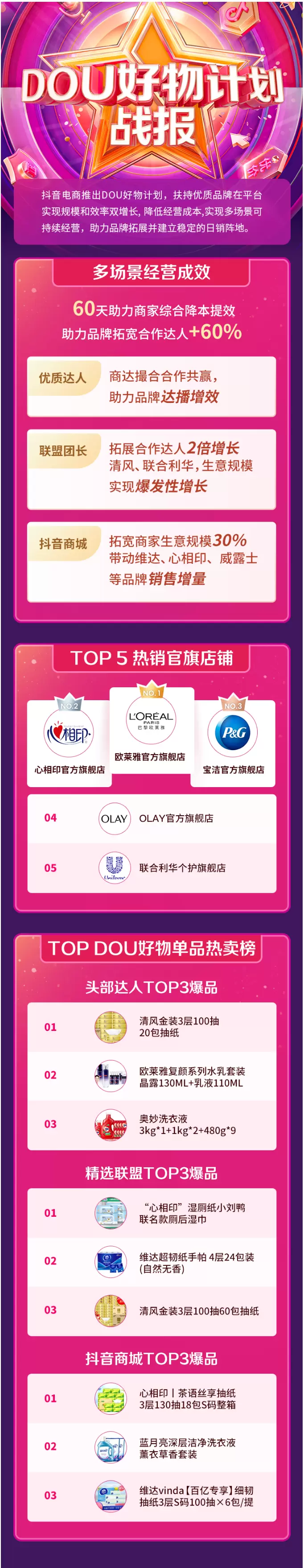 近期,“DOU好物计划”通过整合平台资源,基于双向需求匹配,撮合宝洁集团、欧莱雅、心相印、OLAY、联合利华、威露士、维达、清风、蓝月亮等美妆个护品牌商家建联平台优质达人,为平台开拓了一条商达合作的全新赛道。