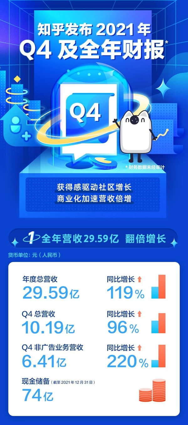 得益于不断扩大的用户规模和单用户平均收入额的增加, 知乎2021年总营收达29.59亿元,同比增长118.9%,其中,第四季度营收为10.19亿元,同比增长96.1%。