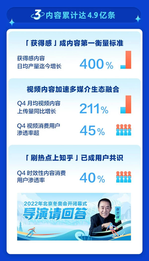 在今年的北京冬奥会期间,知乎对东京夏季奥运会的“技战术大师”形象再次展现,从冬奥比赛的赛事热点、体育运动的技术与战术,延伸至经济、人文、历史、科技等多维度领域,为用户带来专业性强、时效性快、丰富度高、延展性广的“获得感”内容。 “2022 年北京冬奥会开幕式有哪些值得关注的亮点?哪些节目给你留下了深刻印象?”的问题下,包括张艺谋在内的开幕式导演团队的多条亲自回答,在24小时内就获得超过近10万的赞同,满足了用户收获新知的需求并引发了集体情感共鸣。