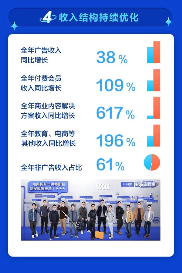 以内容为中心的商业模式,使知乎商业化进程全面加速,并进一步优化收入结构。2021年全年,在知乎多引擎驱动的业务中,非线上广告业务的收入占比已达到61%。