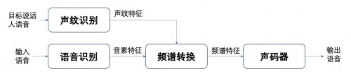 声纹变声是指对一段语音的音色做替换,让它听上去像是另一个人在讲同样的内容。声纹变声的处理过程包含语音的感知分离以及合成两个步骤。首先,声纹变声系统中的语音识别模块会将接受的语音中的语言学信息以及说话人音色信息分离。然后,语音合成模块将目标说话人的声纹与前面提取的语言学内容重新合成新的语音,从而实现音色的变换。