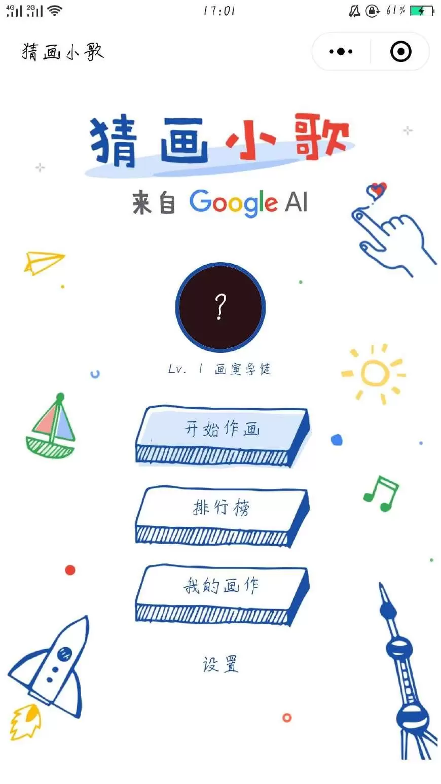 猜画小歌类似于“你画我猜”,后者允许玩家加入猜字队伍中,猜测其他人画的东西。而谷歌则为猜画小歌增加了新意。在这款小程序中,每个玩家将与AI组队对抗,让AI猜猜你画的是什么。