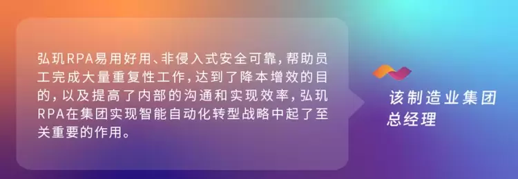 在中国制造向中国智造的转型升级中,数字化、自动化技术日益在实体经济制造业日益发挥重要作用。作为RPA行业的领跑品牌,弘玑Cyclone 与某大型制造业集团达成战略合作,助力该企业完成智能自动化转型,实现降本增效的战略目标。