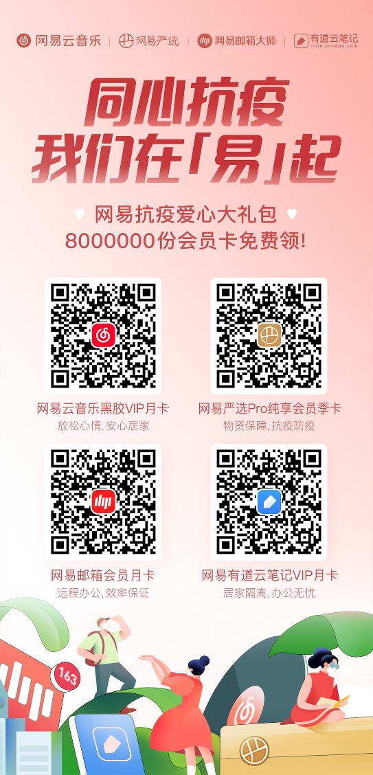 网易云音乐、网易严选、网易免费邮箱及有道云笔记联合送会员,用实际行动助力抗疫
