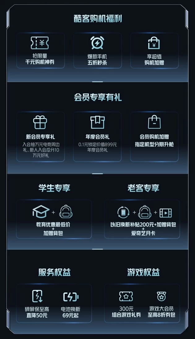 届时,新会员可享受专享礼,包括入会抽万元电竞周边礼、新人入会瓜分10万好礼等等。年度会员可享0.1锁定价值899年度会员礼,会员购机还可加赠“指定机型分期升舱”,更加优惠!除此之外,学生用户可享教育优惠最低价+加赠背包的福利,而老客户则可以享受以旧换新补贴200+加赠背包+加赠爱奇艺月卡,同样划算。活动优惠还包括电池换新低至69起,还可享受300组合游戏礼券、游戏大会员至高8折券包等,可谓是十分超值了。