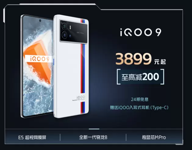 数字系列的另一位新成员iQOO 9,同样有着极高人气。它采用 E5 超视网膜屏,屏幕运用新一代 E5 发光材质,具有超清视效以及优质操控体验。此外,该机还拥有全新一代骁龙8、独显芯片 Pro的加持,具有顶级水准的游戏运行体验,是手游玩家购机的不二之选。此次活动中,该机至高减200,价格低至3899起,同样可享24期免息、赠送iQOO入耳式耳机。