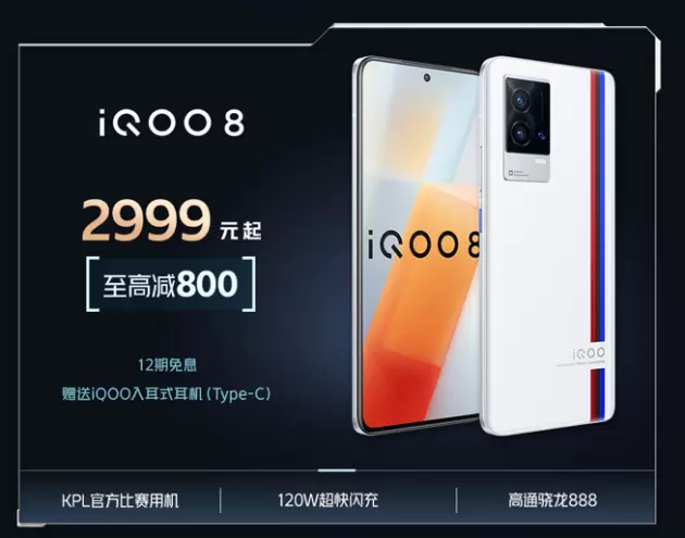 iQOO 8是数字系列的另一位明星成员,该机采用了骁龙888旗舰芯片,更拥有120W 超快闪充的加持,游戏性能、闪充表现同属顶尖水准,而该机也曾作为 KPL 官方比赛用机亮相,足见其强劲性能实力!活动期间,iQOO 8至高减800,到手价2999起,可享12期免息、赠送iQOO入耳式耳机。