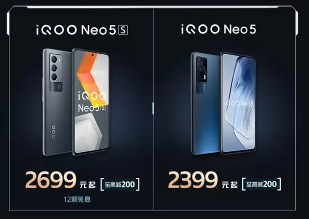 来自 Neo 系列的iQOO Neo5S、iQOO Neo5同样值得关注,两款机型相较同价位其他产品,均拥有性能、配置上的越级优势。其中iQOO Neo5S至高减200、到手价2699起,可享12期免息;而iQOO Neo5至高减200,到手价仅为2399起。
