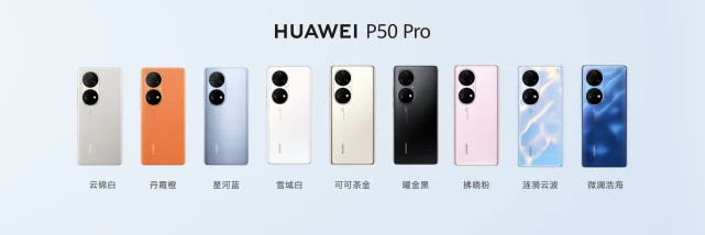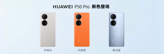 2022年3月16日,华为在2022华为全屋智能及全场景新品春季发布会上发布三款P50系列全新配色:星河蓝、云锦白和丹霞橙,以自然灵感演绎科技美学,开启华为P50系列色彩新生。星河蓝采用抗指纹凝霜工艺;云锦白、丹霞橙采用纤薄素皮工艺,配备纳米微晶玻璃屏幕。同时发布的还有华为P50E,为用户带来更多选择。