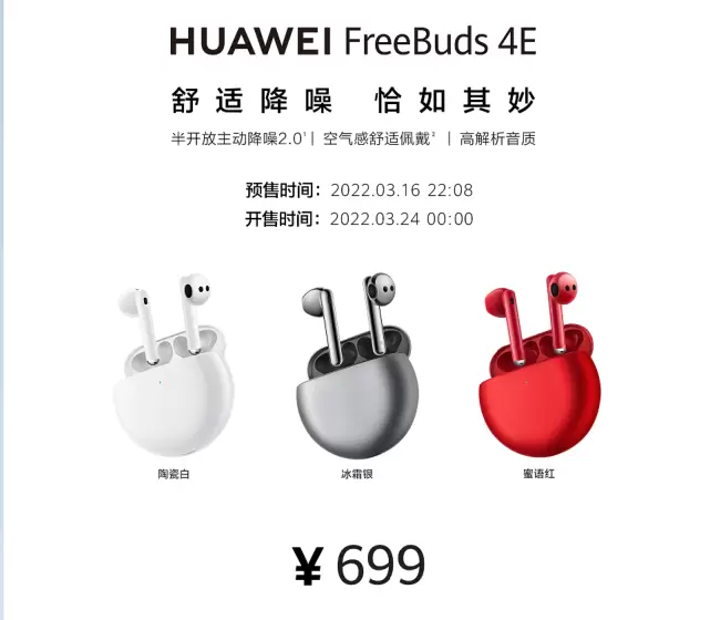 华为FreeBuds 4E无线耳机已于2022年3月16日22:08开启预售,售价699元,预售期间预订可享50元优惠。2022年3月24日00:00正式开售,用户可通过华为官方商城、各大授权电商、华为体验店及授权零售商进行购买。