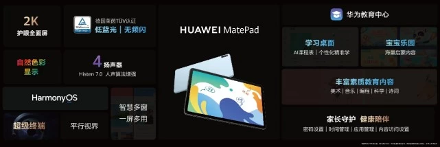 2022年3月16日,在“2022华为全屋智能及全场景新品春季发布会”上,发布了华为全新的智慧平板——HUAWEI MatePad。HUAWEI MatePad拥有专业的学习功能和体验,配备高清护眼全面屏,搭配新升级的教育中心,带来寓教于乐的智慧体验。
