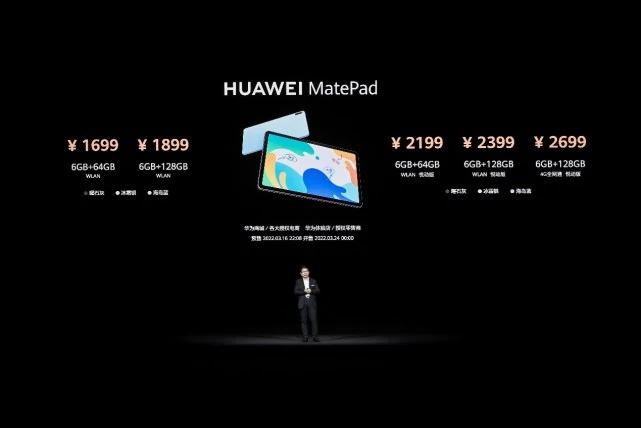 HUAWEI MatePad 10.4英寸拥有冰霜银、海岛蓝、曜石灰三种颜色,将于2022年3月16日22:08开启预售,3月24日00:00正式开售,6GB+64GB WLAN版本售价1699元,6GB+128GB WLAN版本售价1899元, 6GB+64GB WLAN悦动版售价2199元,6GB+128GB WLAN悦动版售价2399元,6GB+64GB 4G全网通悦动版售价2699元。