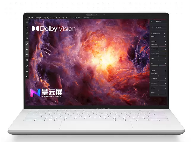 作为一款笔记本,屏幕的好坏直接影响着用户的使用体验,甚至关系着用眼健康。新款幻14搭载了全新的ROG星云屏,2.5K分辨率、120Hz高刷新率,3ms响应时间,500nit亮度,这些参数奠定了优良的观感。此外,针对内容创作者,这块星云屏还支持100%DCI-P3专业广色域和杜比视界,并通过了潘通色彩认证,保证颜色不仅要绚烂,还要“所见即所得”。除此以外,星云屏通过了莱茵TÜV低蓝光护眼认证,为视力健康保驾护航。