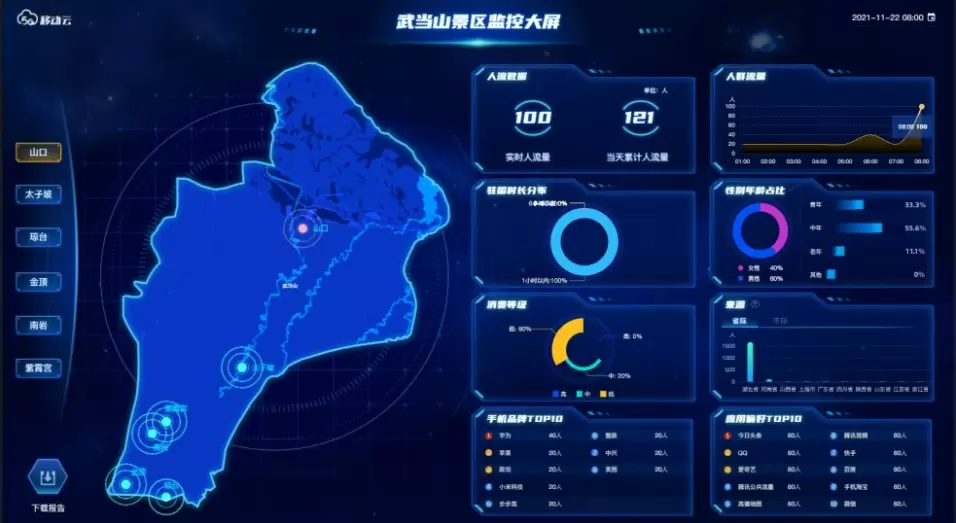 景区用户管理方面,在湖北丹江口有这样的一个平台,它是中国移动以旅游云数据中心为基础,整合文旅局、景区、涉旅企业及运营商等数据,通过统一的数据采集、清洗、转换,最终以可视化大屏的形式将数据呈现,为监管部门提供旅游产业全方位的综合监测、监控预警和决策支持。