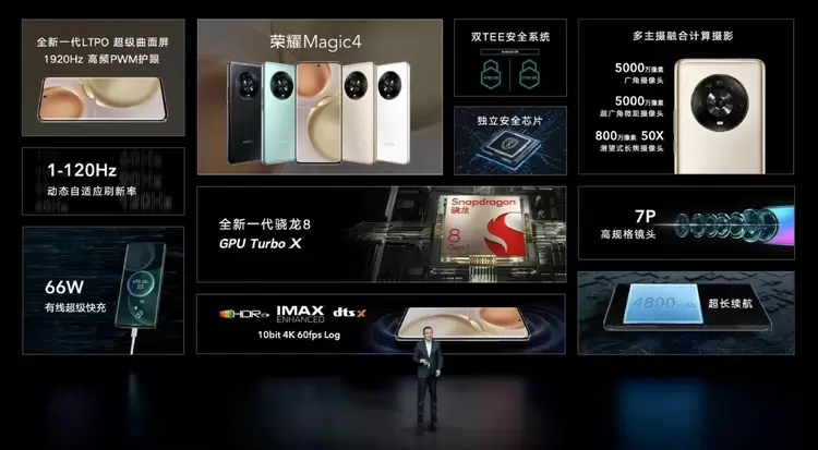 其他配置部分,Magic4系列一如既往的丰富:独立安全芯片、双TEE安全系统等一应俱全。而按照惯例,荣耀Magic4至臻版拥有更强的硬件规格配置:采用超曲纳米微晶面板,5倍抗跌性能;搭载6400万像素超广角主摄像头和独立影像芯片,是业界首款双自由曲面摄像头。