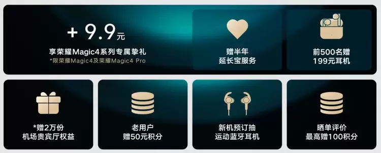 随着荣耀Magic4系列三款新品全员亮相,荣耀商城还推出了全款预售享更多专属权益的福利活动。活动期间,在荣耀商城App下单的用户可享受最高24期分期免息,加9.9元享9大新机权益,以旧换新最高补贴3999元,抽送7000份保值换新服务权益,以及荣耀碎屏宝、延长宝6折优惠等一系列加码福利。