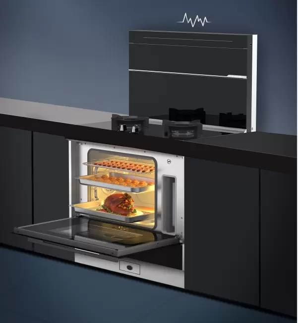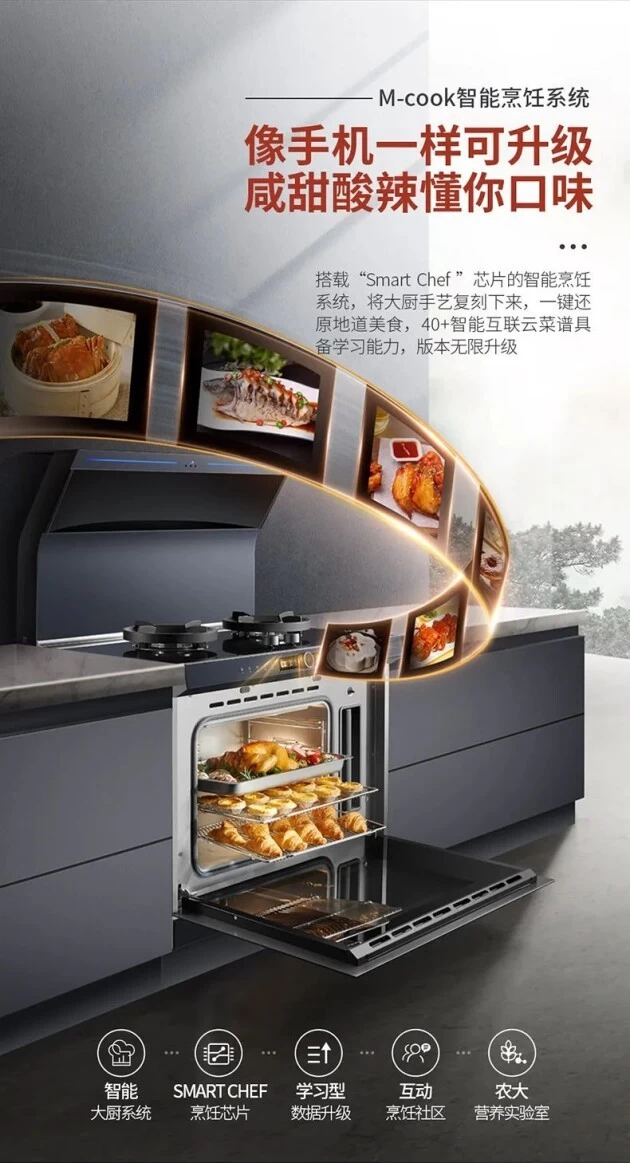 新X7搭载新一代直流变频电机,最大火力5.0kW大火力,一键爆炒模式之下,吸力高达21m³/min,轻松吸净呛鼻油烟。再加上1000Pa最大静压,就算是高峰烹饪期也无惧油烟倒灌的情况发生,让下厨者只闻饭香不闻油烟味。更有大师级蒸+烤+空气炸,同样搭配了MCOOK智慧厨房平台,真正实现了“更大、更快、更强”,无愧王者归来!