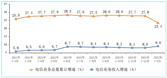 2021-2022年1—2月份电信业务收入和电信业务总量累计增速