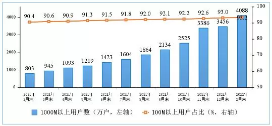 截至2022年2月份末,三家基础电信企业的固定互联网宽带接入用户总数达5.45亿户,比上年末净增930万户。其中,100Mbps及以上接入速率的固定互联网宽带接入用户达5.08亿户,占总用户数的93.2%,占比较上年末提高0.2个百分点;1000Mbps及以上接入速率的固定互联网宽带接入用户达4088万户,比上年末净增632万户。