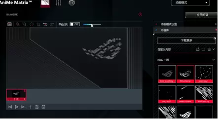 其中,动画模式下自带10种ROG主题动效,可导入自定义动画,创造独一无二的动画效果,此外还可以调整对比度、亮度、以及动画间隔;