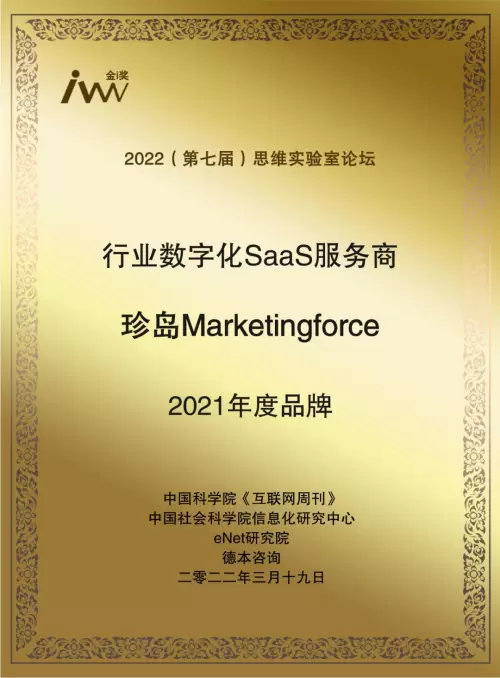 2022(第七届)思维实验室论坛颁奖名单是由中国科学院主管、科学出版社主办的互联网周刊杂志所举办,定位于对2021年度的深度发现和总结。珍岛Marketingforce平台应用云计算、大数据、人工智能技术,打通珍岛营销云(T云)、珍岛销售云(珍客SCRM)、珍岛商业云、珍岛企服云、珍岛服务云产品矩阵,打造一站式智能营销生态,为企业带来贯穿全链路、全场景的一站式智能营销服务,涵盖从公域宣传推广到私域沉淀转化及数字化客户资产增值,再到企业营销后的运营管理整合等,贯穿营销前、中、后的全链路,为企业带来数字化营销服务,以满足数字化智能化时代企业的发展诉求,目前已为超10万家企业级客户带来增长助力,持续提供有竞争力的产品与服务。