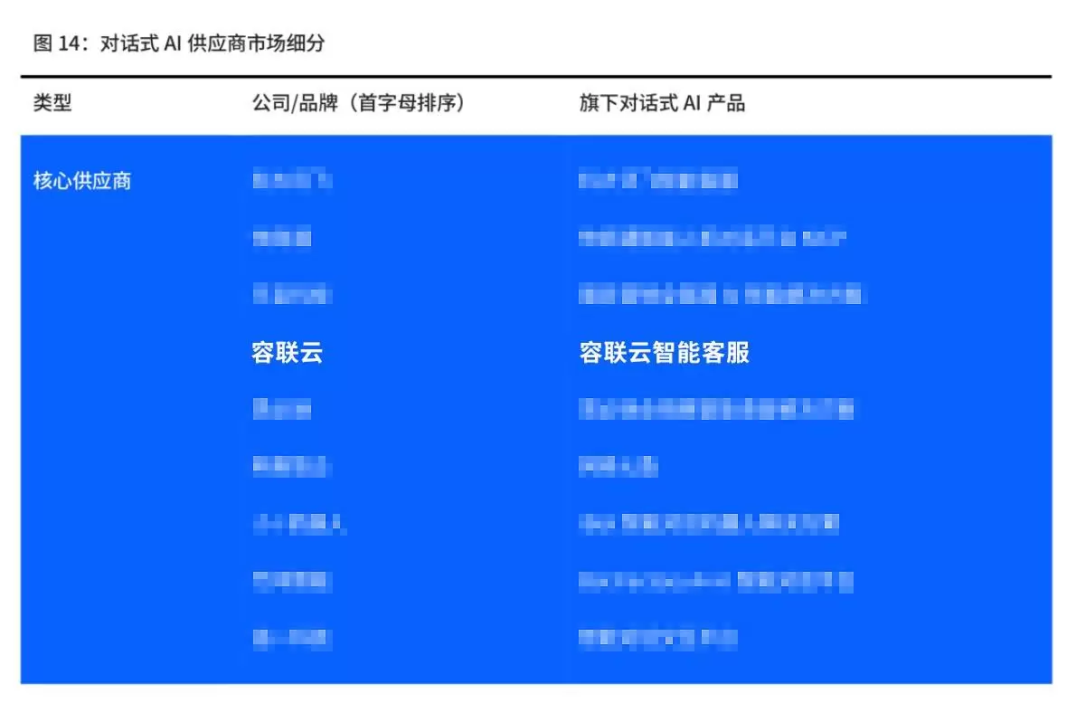 根据供应商旗下对话式AI产品在中国市场的收入情况,字母点评将对话式AI市场上的供应商分为两部分,容联云入选核心供应商。