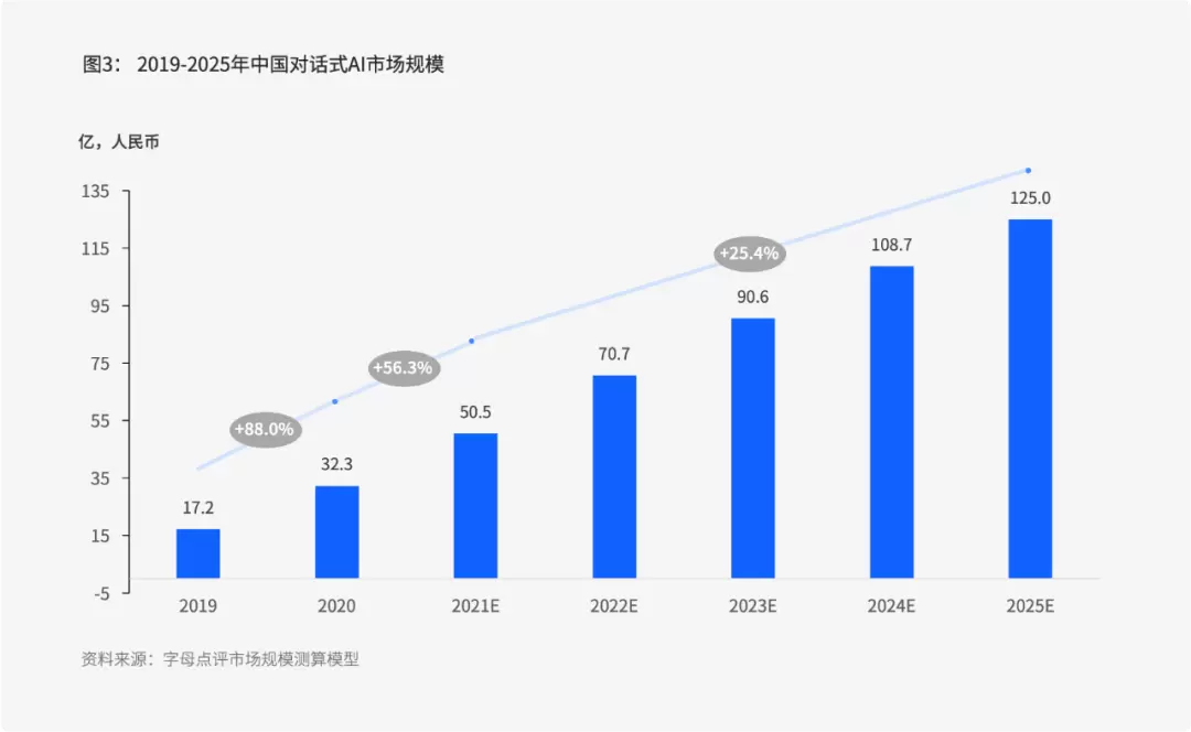 根据字母点评统计,2020年中国对话式AI市场规模达到32.3亿元,2021年达到50.5亿元,较2020年增长56.3%,呈现高速增长。