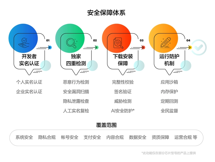 当用户下载、安装应用时,华为应用市场通过对应用和开发者的多重校验、对病毒与风险的威胁检测以及AI安全防护等流程规范和技术手段,再次确保应用合法合规。