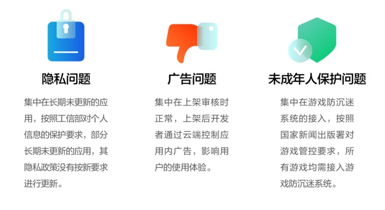 2021年,华为应用市场不定期复测超过20万款应用,处置上架后涉嫌违规的应用近6万款。涉嫌违规应用的常见问题,主要包括应用的隐私政策未以明示方式征得用户同意,应用频繁弹出广告且无法立即关闭以及未按规定接入游戏防沉迷系统。对此,华为应用市场严格履行监管部门要求,对存在涉嫌违规的应用进行整改或下架。同时,华为应用市场积极响应、主动配合各项政策与规定,针对隐私政策、应用内广告、游戏防沉迷、涉未成年人及教育应用低俗内容等方向展开多轮重点专项复测,为用户有效降低使用涉嫌违规问题应用的风险。