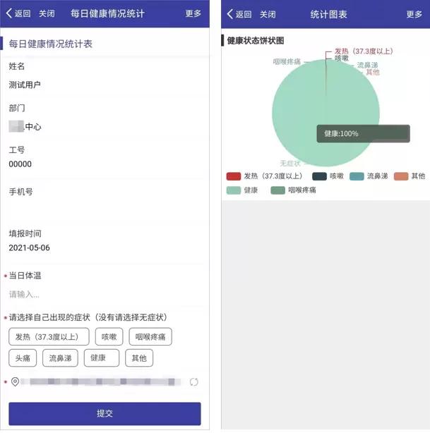 员工可以通过手机app随时进行上报健康情况、行程详情。