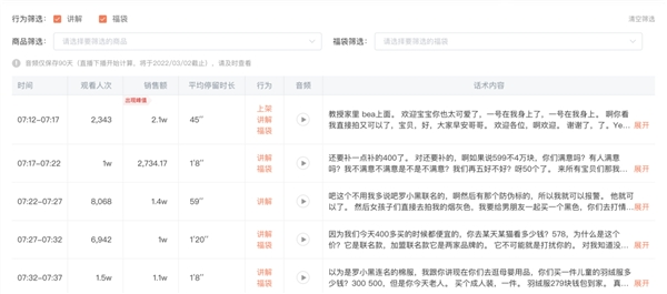 解决这个问题的最好办法就是向优秀的同行学习,但是一个一个去观看同行的直播间又过于繁琐,这时使用蝉妈妈的热门话术导出功能,只需提前订阅优秀同行账号,即可一键获取直播全程话术文本及录音,还筛选主播/助播,直播间关键环节话术,轻松学习带货精髓,提高话术转化效率即可一键完成,不必盯着同行直播间。