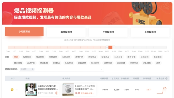蝉妈妈爆品探测器以小时、一天、三天、七天为单位,随时查看短视频带货榜,发现最有价值的内容与潜力爆品。