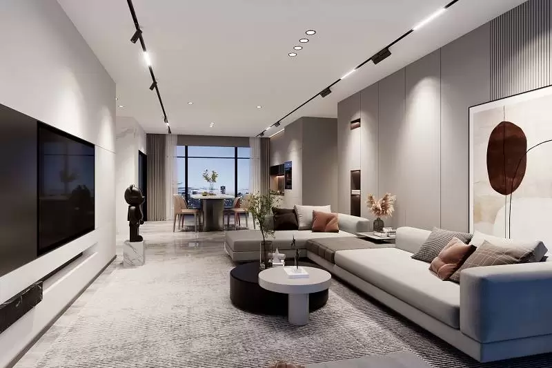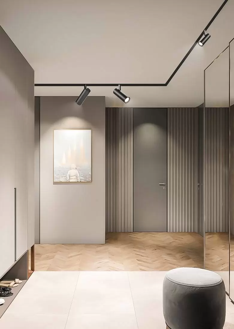 泛光灯搭配格栅灯作重点区域照明,营造出空间的层次感;局部的挂画、装饰品等艺术区域,通过添加轨道射灯,美化物品的同时,增添空间的艺术感。