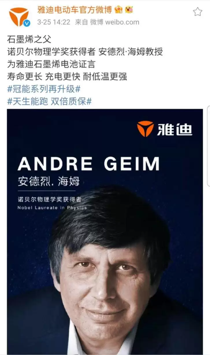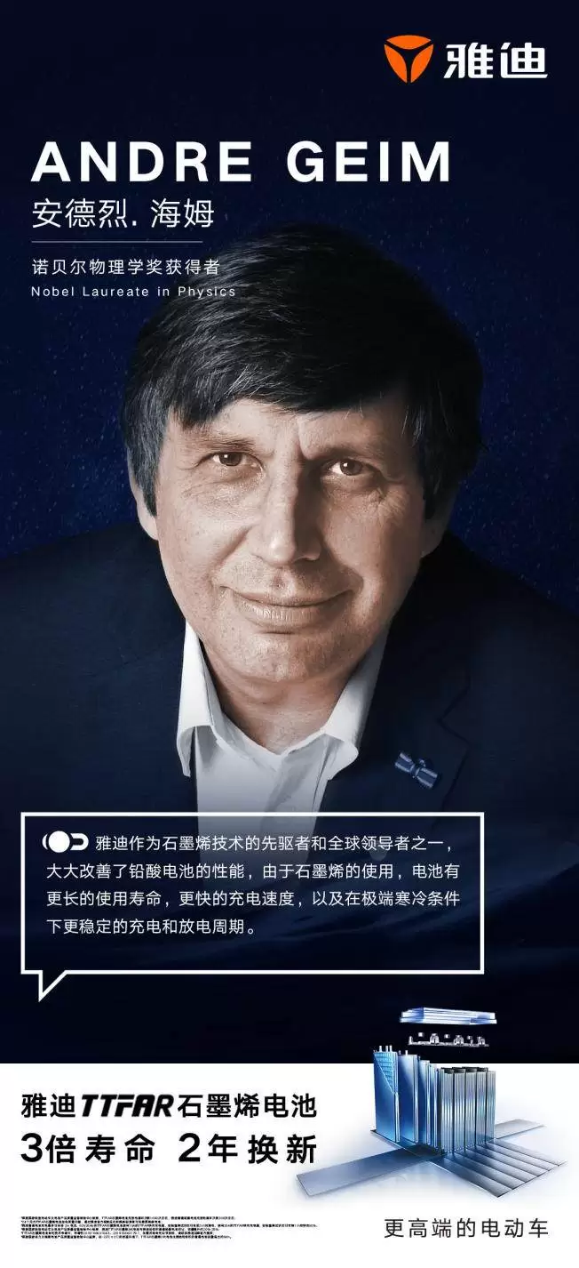 原来,行业首次将石墨烯材料应用到两轮电动车电池的雅迪电动车,得到了“石墨烯之父”——诺贝尔物理学奖获得者安德烈·海姆教授的高度肯定。