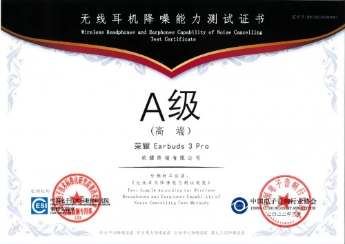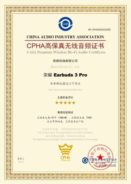 在荣耀Earbuds 3 Pro之前,通过CPHA认证的产品共有11款,从10999元的森海塞尔高端旗舰高保真入耳式耳机IE 900,再到华为推出价格为的1999元的高端头戴蓝牙耳机HUAWEI Freebuds Studio。但TWS耳机受限于体积、成本、功能等因素,一直没有产品通过CPHA认证,荣耀Earbuds 3 Pro则是首款获得了CPHA认证的TWS耳机,并且在主观听音评价方面取得了五星好评的优异成绩,同时也是首款获得CPHA认证的千元内的产品。