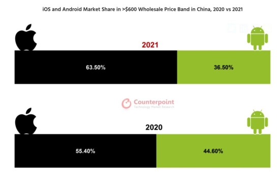 Counterpoint 报告显示,在2021年国内市场600美元以上价位范围内,苹果的iPhone设备已经占据了63.5%的市场份额。对比2020年的55.4%份额占比,有着幅度不小的提升。而安卓智能手机市场份额从2020年的44.6%缩水至36.5%。