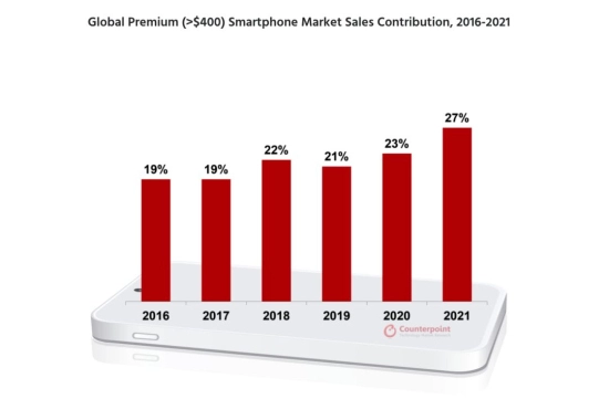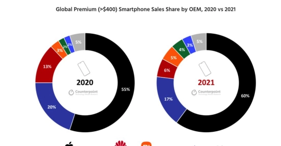根据 Counterpoint 的最新数据,2021 年全球高端(批发平均售价超过 400 美元)智能手机市场销售额同比增长 24%,远高于整体手机市场 7% 的同比增长,并且份额也达到历史新高的 27%。