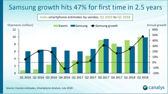 最近几个季度,三星和小米一直是最大的两大赢家,两家公司在争夺榜首。今年早些时候,小米略胜三星,但对于印度这个巨大而且不断增长的市场,双方的竞争仍然十分激烈。根据Canalys的最新数据,这两家公司2018年第二季度的智能手机出货量为990万部。
