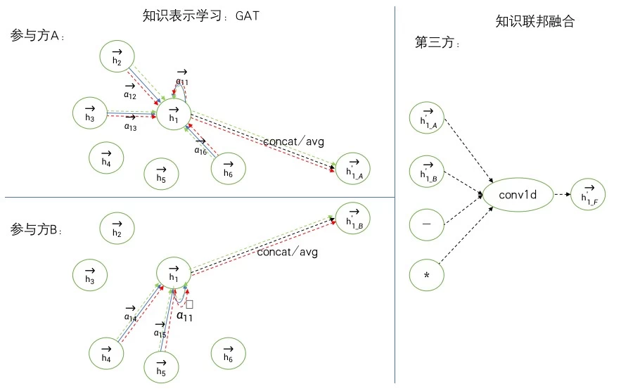 知识联邦融合:各个参与方依据自身知识,经过知识编码,形成对相同实体的各自低维向量表示。第三方接收各参与方抽象知识,进行联邦融合,得到综合后的向量表示。第三方获取的抽象知识不包含敏感数据,也不可反推出各个参与方的图谱原貌。见上图右半部分。