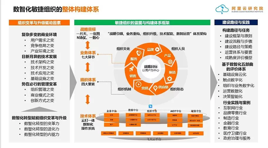 想要打造敏捷、高效、灵活的组织,需要从传统金字塔式的科层结构转向以客户为中心、柔性化、扁平化的网状结构,实现多元化、平台化、生态化,使得组织保持方向正确,又始终充满活力与韧性。数智化技术通过“数据+算力+算法”的赋能,一方面可以实现跨组织、跨系统、跨终端的网络协同与高效协作,另一方面可以实现以用户为中心的全链路、全要素、全方位的实时洞察、智能决策与业务创新。数智化转型推动了组织和业务全链路的数字化、网络化和智能化,穿透“人、事、物、财、场”的壁垒,实现了“需求牵引供给、供给创造需求”的高水平动态平衡。