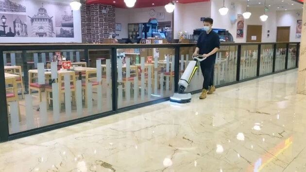 基于此,普渡科技再度发力,推出了专业微型数字洗地机SH1,该产品弥补了机器人在复杂场景和数字看板的“盲区”。SH1可实现洗地、吸干一气呵成,搭配了标准洗地、单吸、水刷、单刷四种清洁模式,用户可根据污渍类型和脏污程度灵活切换定制刷头及洗地模式,做到轻污轻洗、重污重洗。该产品专为环境复杂、地面不规则的场景所打造,可以应用在以餐厅为代表的障碍物较多的复杂地面环境。相较于市面上的商用手持洗地机,SH1更为轻便灵活,可以处理各种轻渍重污,也可以游刃有余地清理贴边区、低矮区、桌椅区等不规则区域。