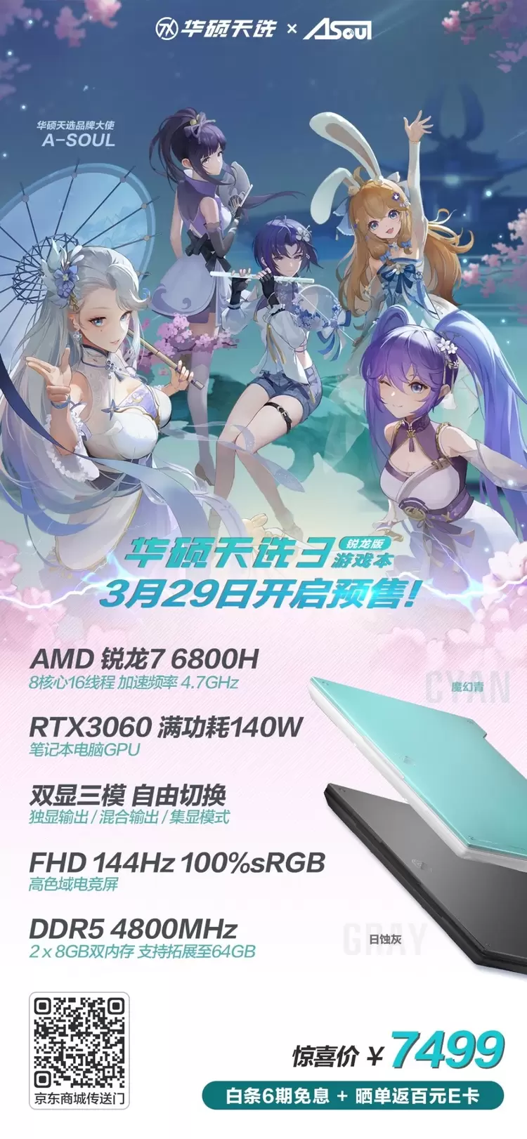 全新配置的华硕天选3锐龙版,搭载AMD锐龙7 6800H+满血RTX 3060,144Hz高刷电竞屏版本到手仅需7499元,购机还可享白条6期免息+晒单返百元E卡的超值福利!
