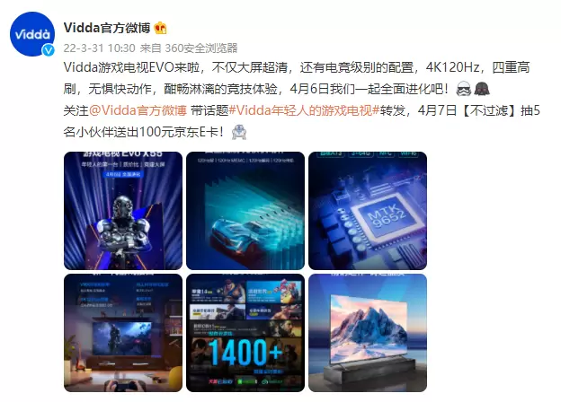 3月31日消息,Vidda官方微博放出6张海报,详细公开了即将发布的新品游戏电视Evo X55的六大卖点,其中4K/120Hz四重高刷、ALLM自动低延迟游戏模式等都是游戏玩家们最心心念念想要拥有的功能。而这款新品的正式发布会将在4月6日,这组海报可谓提前曝光。目前,该机已经在京东开启盲约,咨询客服即可领取100元新品券。