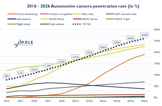 根据Yole的报告显示,2021年全球车载摄像头销货量预计为1.72亿颗,到2026年销量将达到3.64亿颗,在这5倍的增长中,增速最快的将是内视摄像头,CAGR达到22.4%。未来,一辆汽车不仅仅会在车外遍布摄像头与传感器,在车内同样会大大增加摄像头的数量,车辆评估标准体系Euro NCAP专门表示有效的驾驶员监控系统也是自动驾驶的先决条件,确保必要时把控制权交还给适合驾驶且能够驾驶的驾驶员。